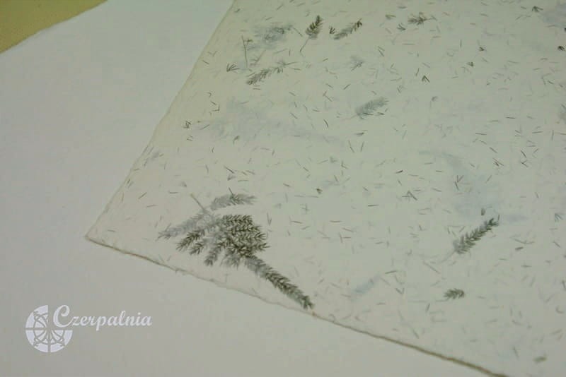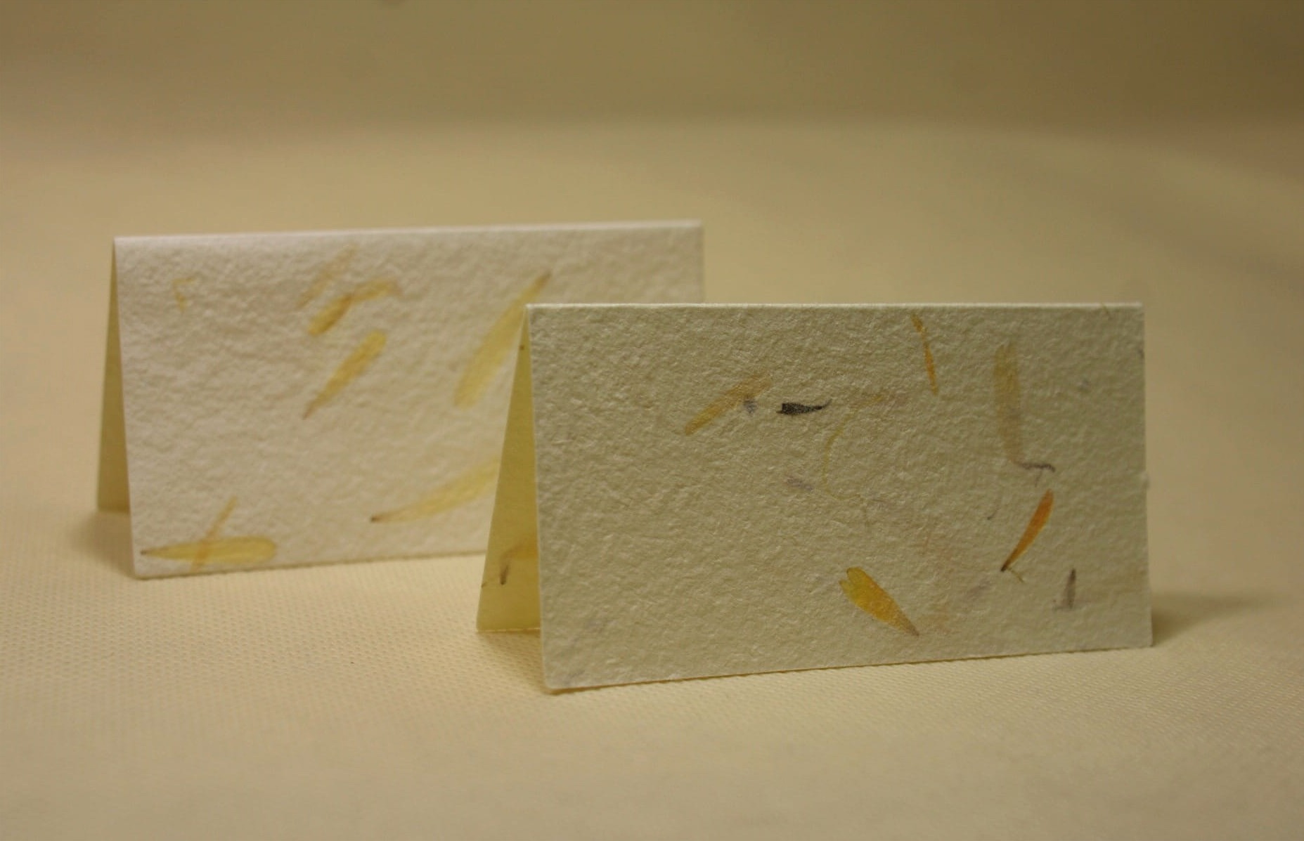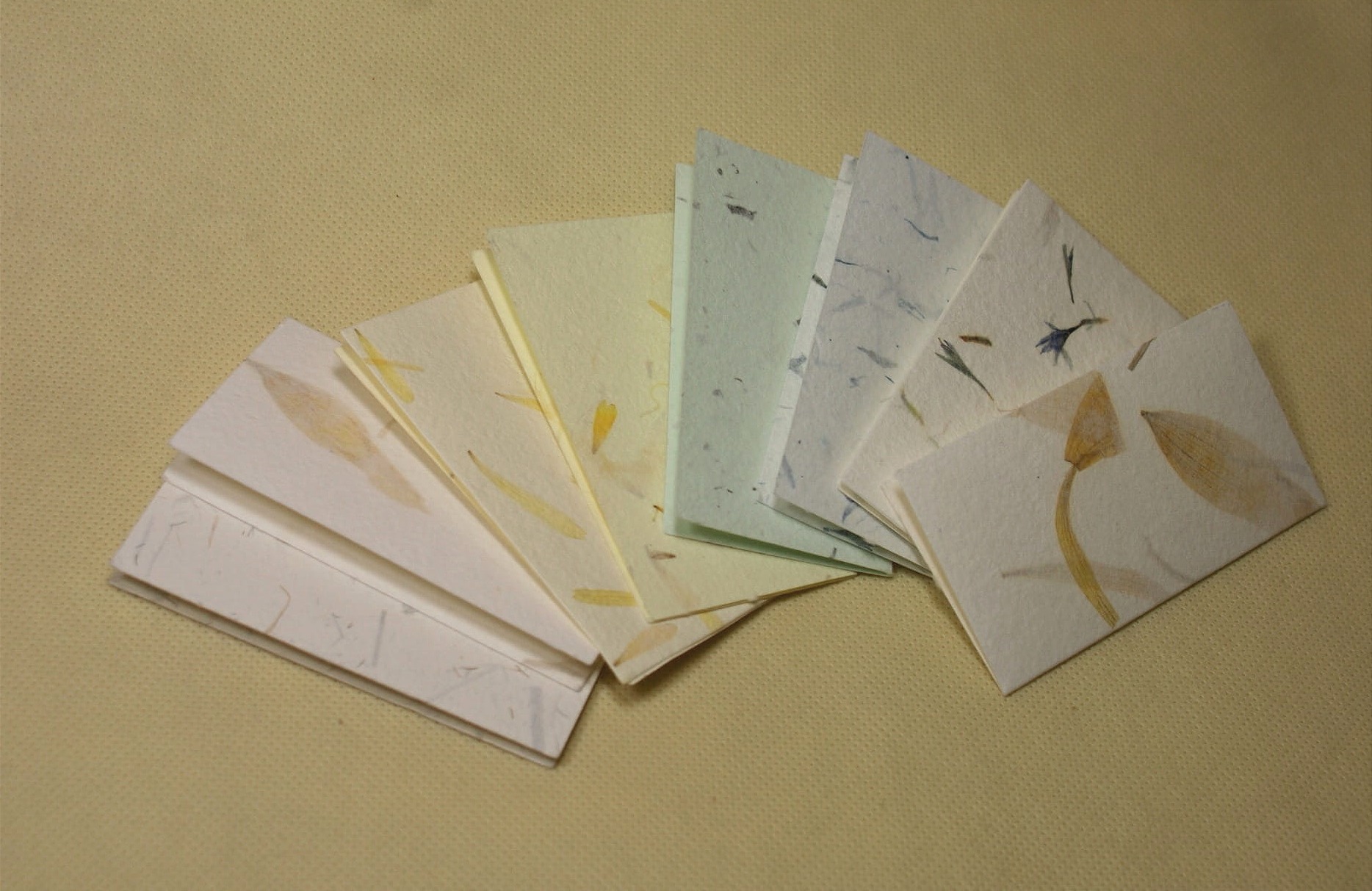 Niewielkie bileciki wycięte zostały z różnych rodzajów papierów czerpanych z dodatkami kwiatów, traw, ziół itp.