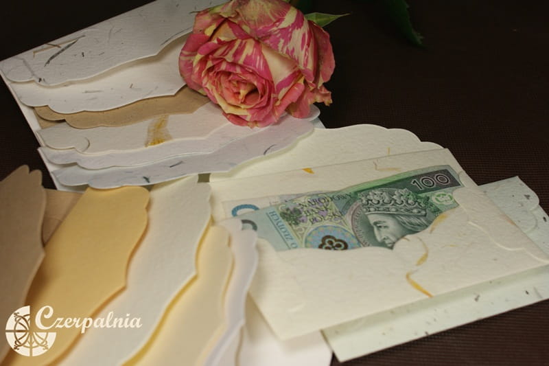 Koperty prezentowe zostały wycięte z ręcznie czerpanych papierów w delikatnych, pastelowych kolorach. Fantazyjny kształt koperty i bilecik do kompletu sprawiają, że są one idealne na różne upominkowe/prezentowe okazje. Polecam szczególnie do eleganckiego wręczenia banknotów, kart czy bonów podarunkowych, zaproszeń.