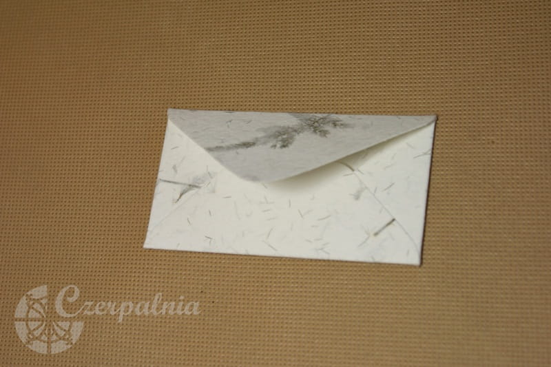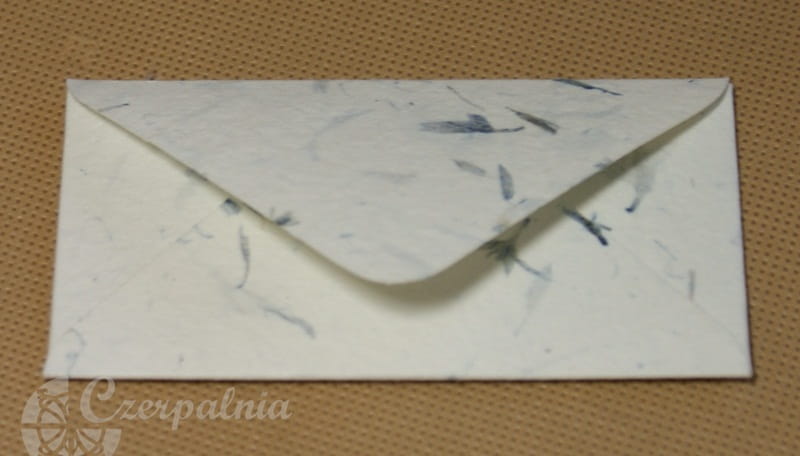 Mini kopertki wycięte zostały z papierów czerpanych z różnymi roślinnymi dodatkami - płatkami kwiatów, listkami ziół, trawami.