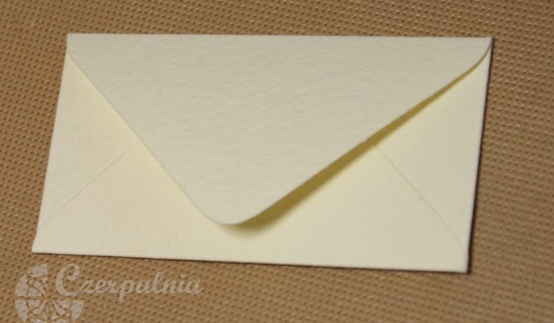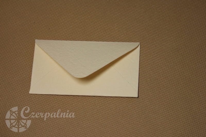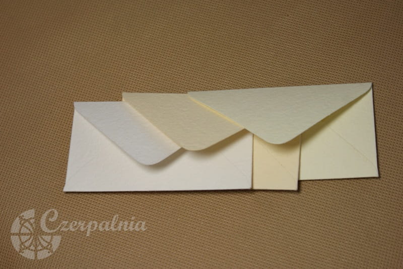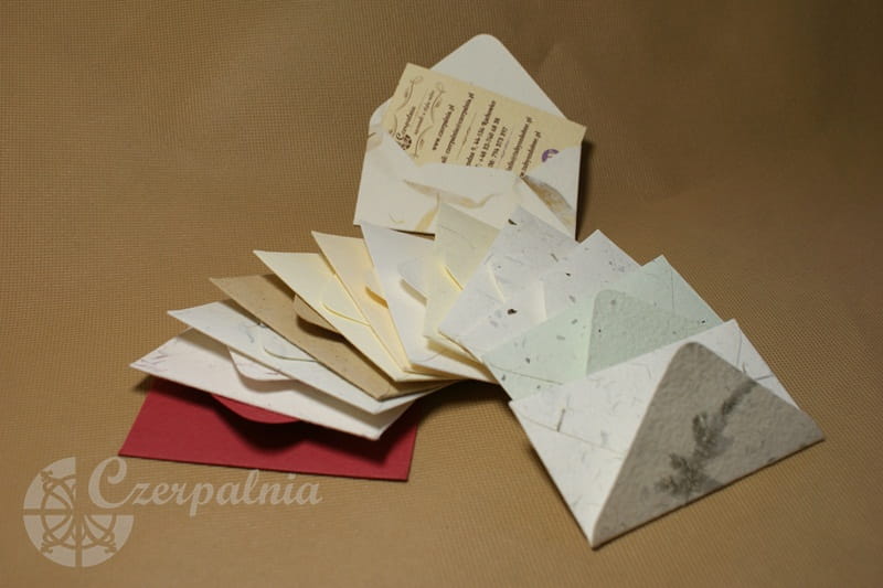 Mini kopertki wycięte zostały z różnych rodzajów papierów czerpanych kolorowych. Trójkątna klapka.
