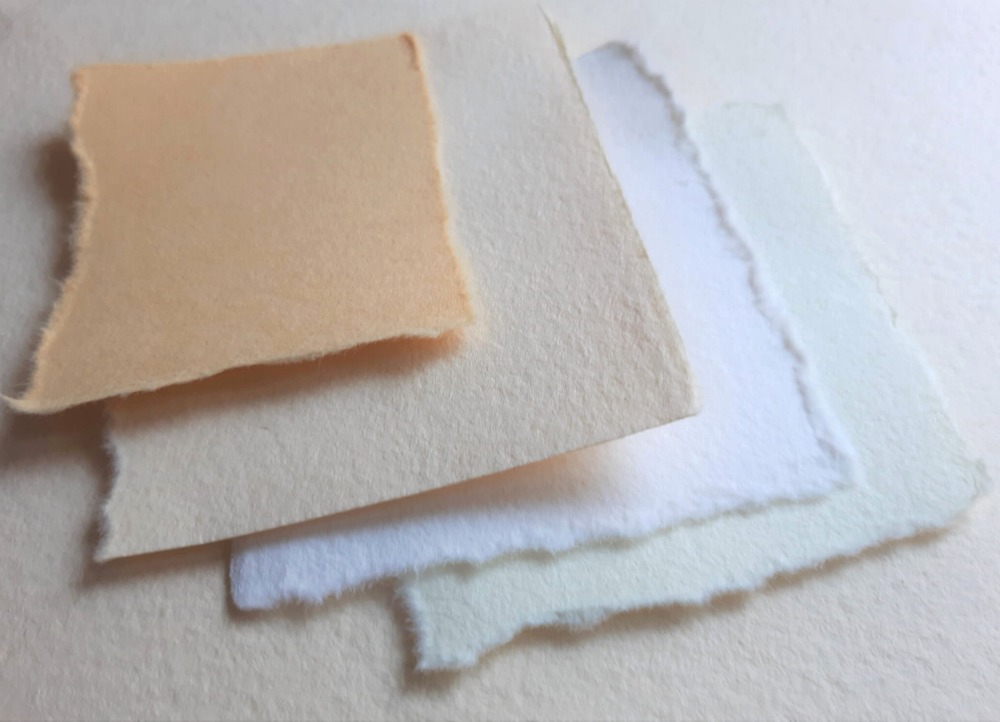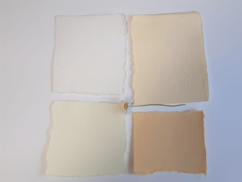 Pastelowy, ciepły odcień ecru, wszystkie brzegi arkuszy nierówne, uzyskane dzięki ręcznemu czerpaniu. Aby łatwiej było określić kolor papieru i wyobrazić sobie jak będzie wyglądała wykonana z niego praca poniżej zamieszczam zdjęcia papieru ecru w zestawieniu z innymi kolorami papierów oraz przykłady moich realizacji.