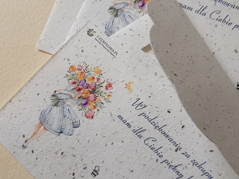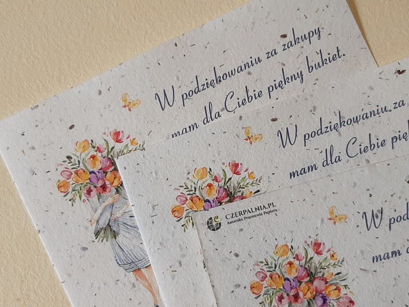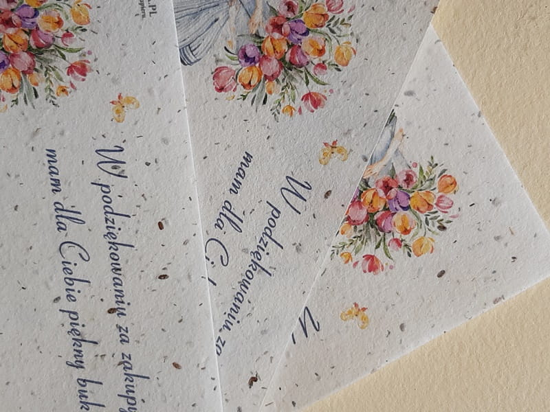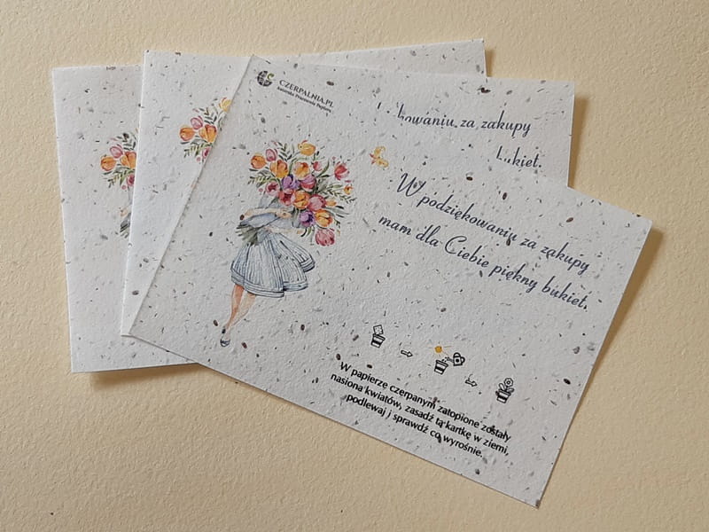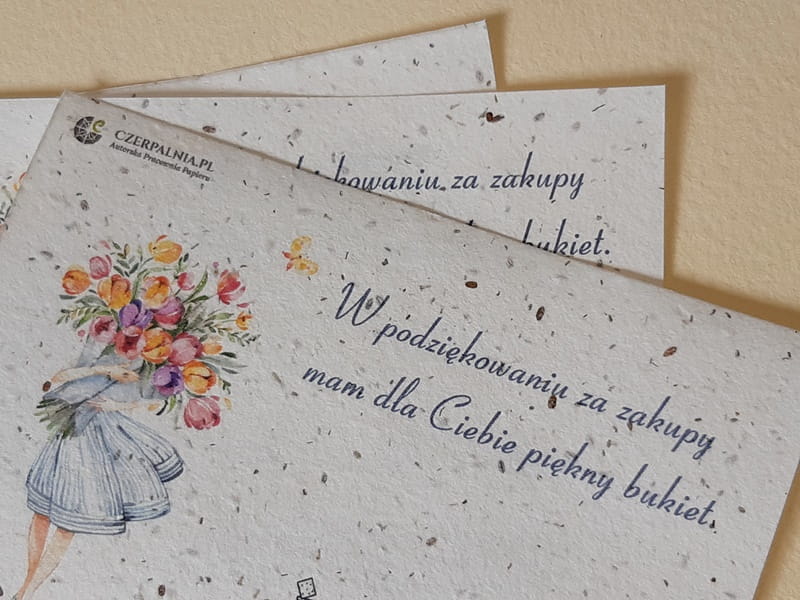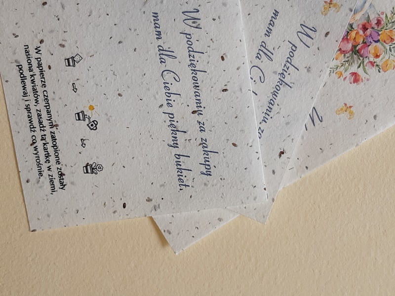 Podziękowanie dla Klientów wydrukowane na papierze czerpanym z nasionami to nie tylko miły dodatek do paczki z zamówieniem ale też bardzo zaskakujący i zapadający w pamięć upominek. Wydruk wykonany został na papierze z nasionami kwiatów: maciejka, rumianek i stokrotka.